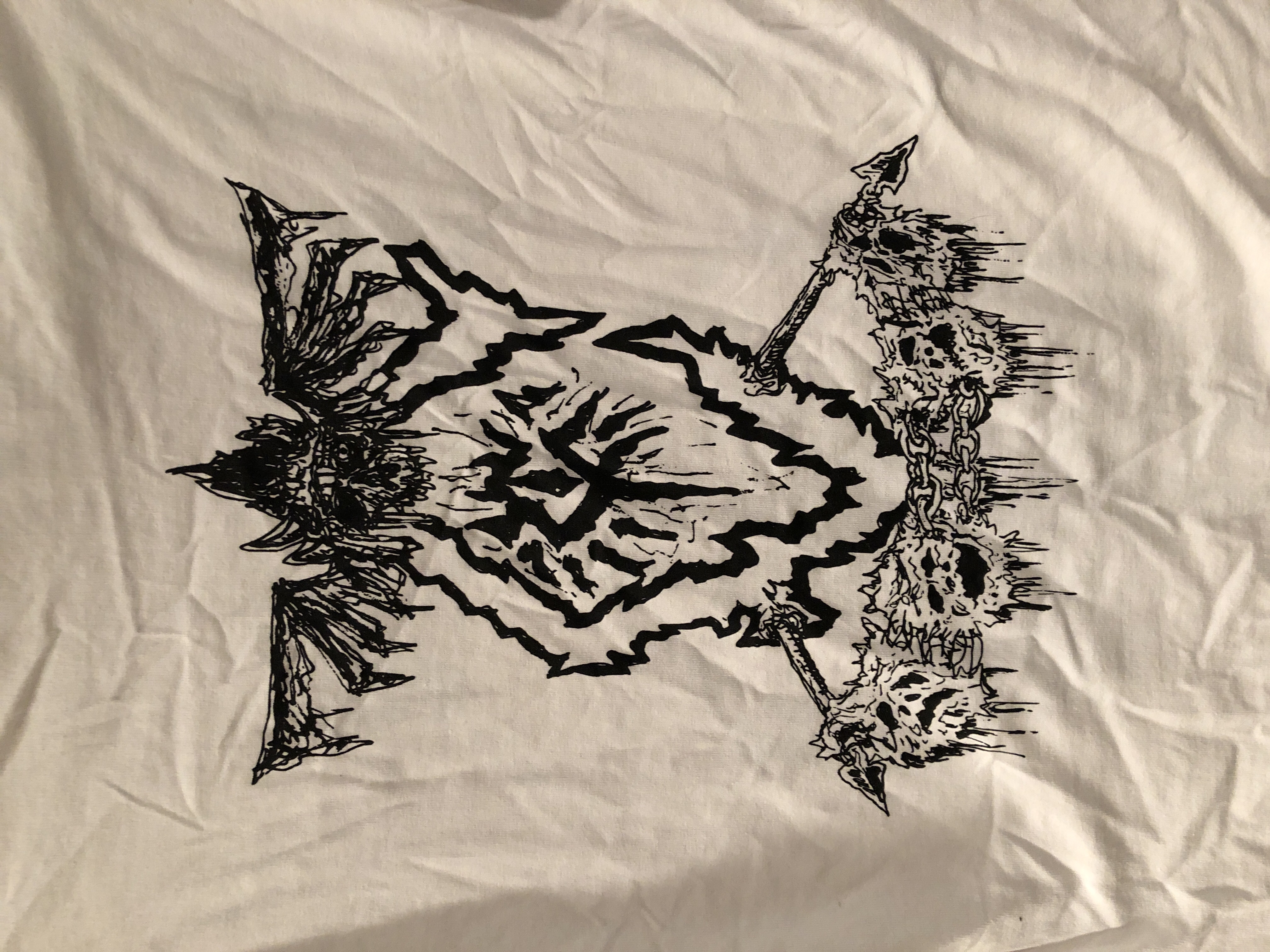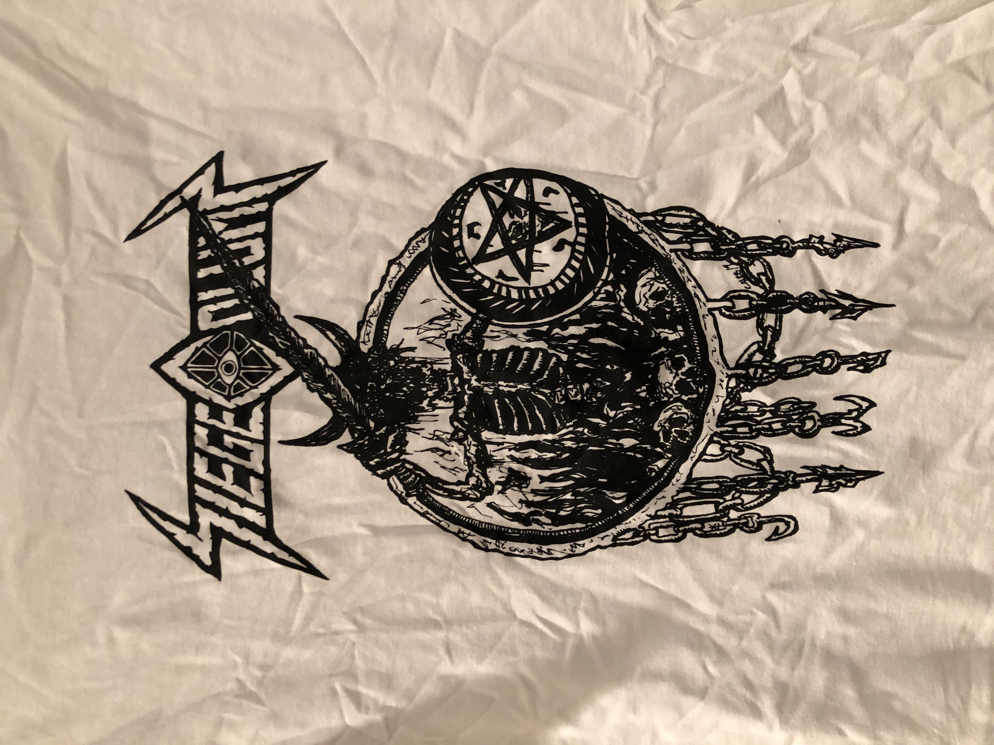 White two sided shirt by cosmic void art with redone secret forces of the pentgram front print and back print