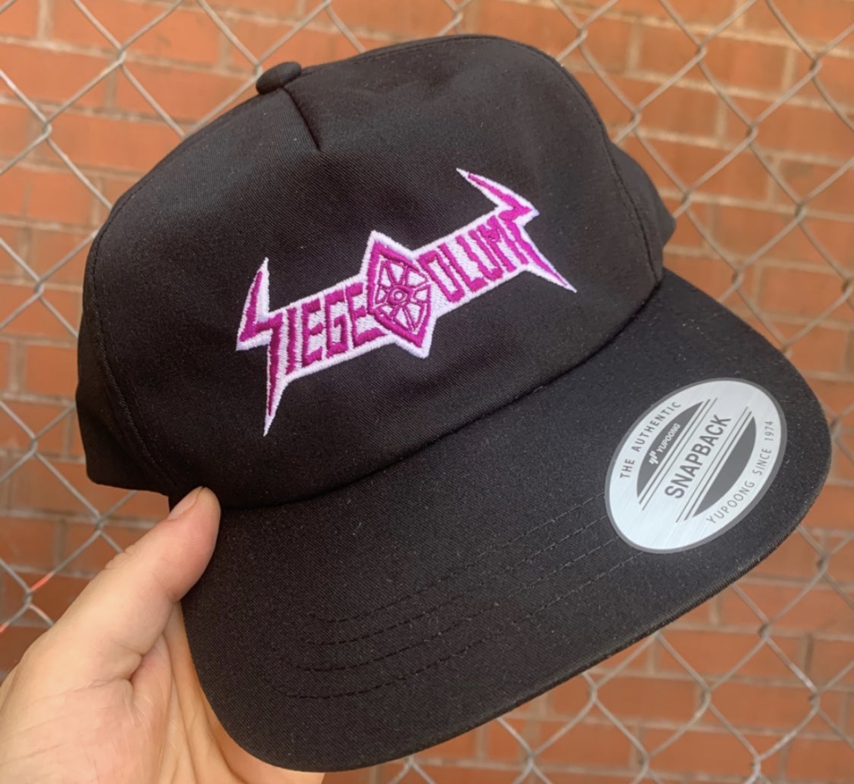 Siege column logo on a black one size fits all yupong Unstructured 5 panel hat